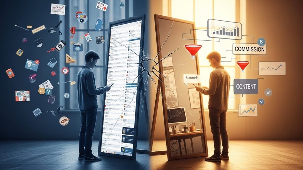 وهو مبني على منهج يخرق واحدة من أكبر المعتقدات الخاطئة في التسويق بالعمولة: فكرة أنك يجب أن تبني أولًا… ثم تبيع لاحقًا.
